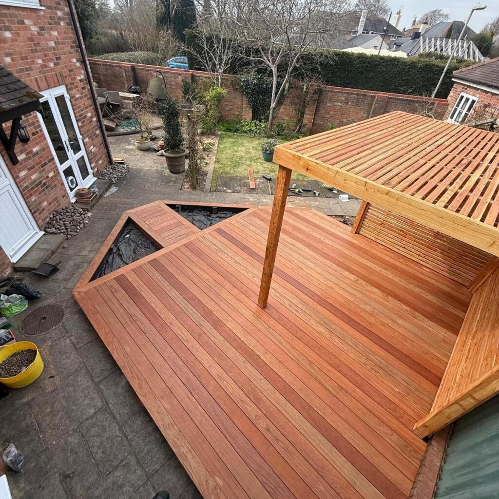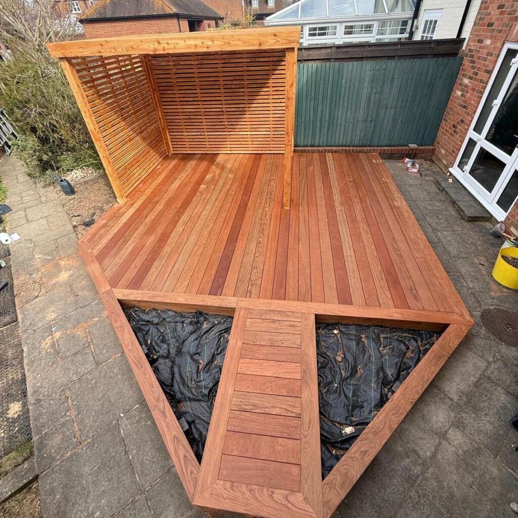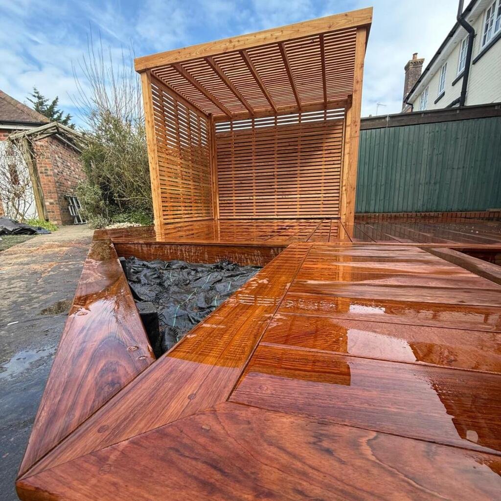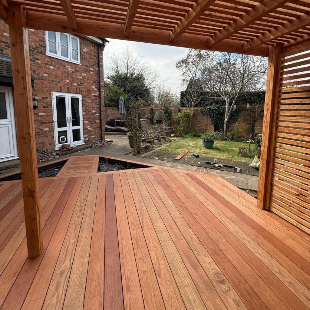 Using rich Jatoba hardwood decking boards paired with a sustainable Plas-Pro recycled plastic sub-frame, we designed a family-friendly space that balances natural beauty with long-lasting durability. The addition of a contemporary Larch pergola adds both shade and character, making this garden retreat a perfect place to relax and unwind.
