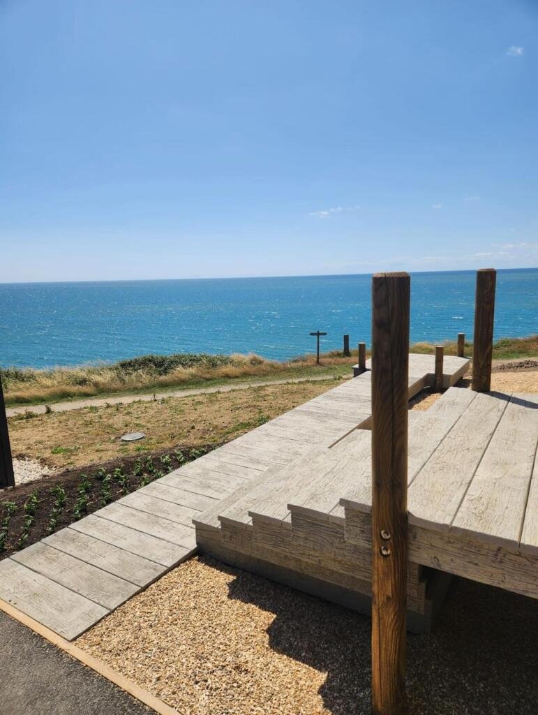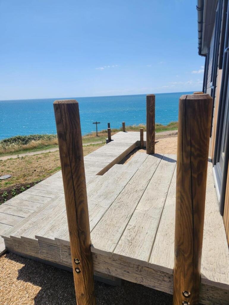 We recently completed a striking raised decking installation on the cliffside at West Bay, Bridport, using Millboard’s Weathered Oak boards in the Driftwood finish.